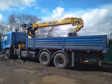 КМУ HIAB 190 TM-6 Корея, тросовая подвеска крюка, управление с сиденья оператора на колонне, два гидроцилиндра подъема, отрицательный угол наклона стрелы. (грузовой момент 18,5 т*м, макс. г/п на вылете 1,52 м – 8000 кг; г/п на макс. вылете 19,4 м – 400 кг) с дополнительными опорами в хвостовой части. Металлическая бортовая платформа после установки КМУ, внутренние размеры ДхШхВ, мм: 6112х2470х730